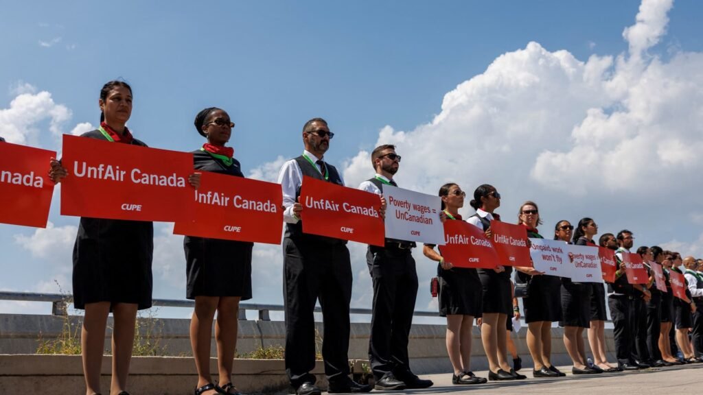 Air Canada flight attendants, represented by the Canadian Union of Public Employees (CUPE) hold a picket at one of four airports to highlight their pay demands in contract negotiations with Canada’s largest airline, outside Toronto Pearson International Airport in Mississauga, Ontario, Canada August 11, 2025.