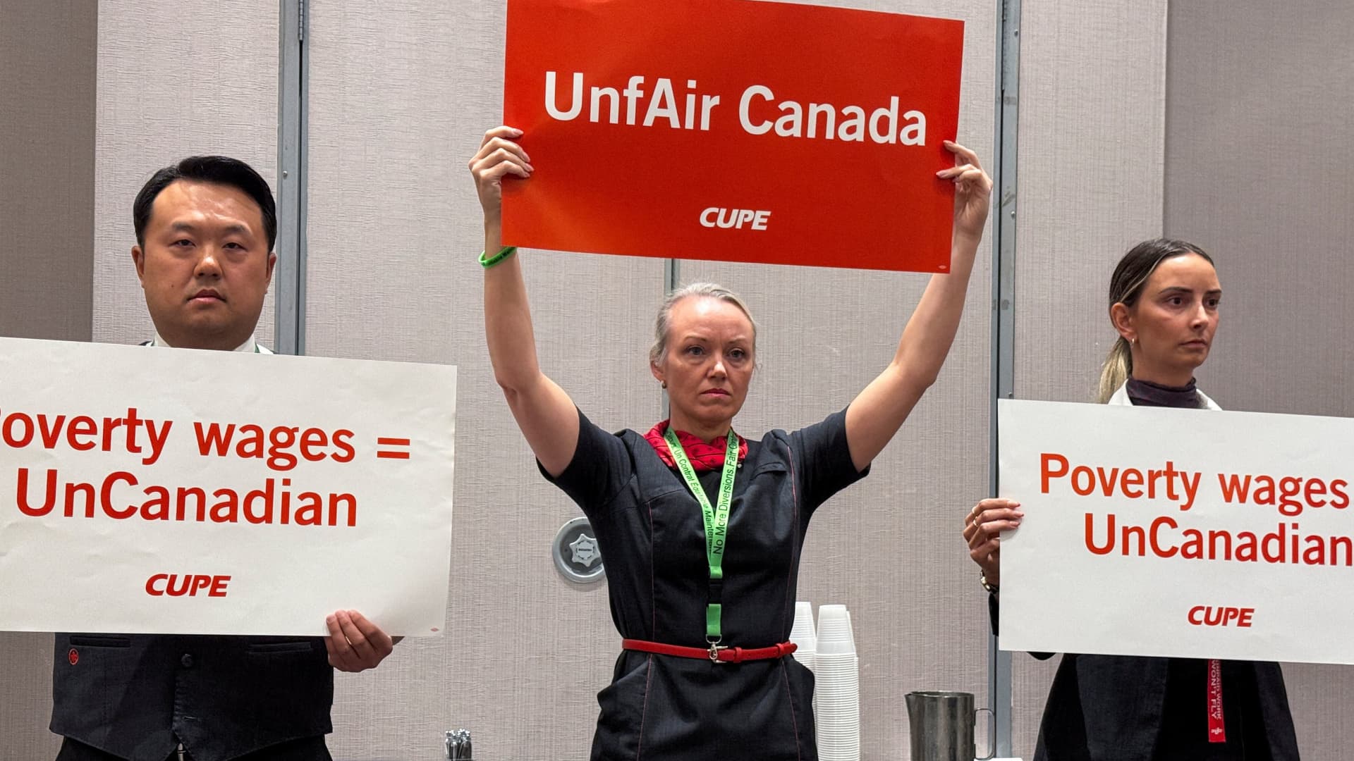 Union activists hold placards, as they interrupt a press conference by Air Canada executives, ahead of a potential strike by Air Canada flight attendants, at a hotel in Toronto, Ontario, Canada, August 14, 2025.