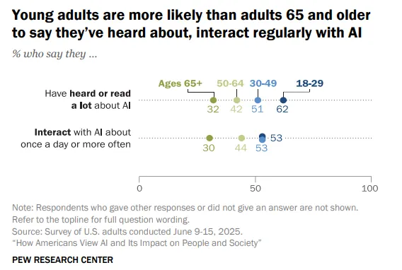 The generational divide shows that the younger the generation, the more exposure to AI they will have in their day-to-day lives. According to the study, 62% of those under 30 say they have heard or read a lot about AI, compared with 32% of those ages 65 and older.