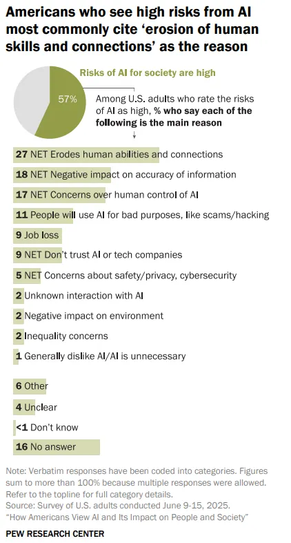 When asked to explain their concerns, respondents most frequently cited the erosion of human abilities and connections—people becoming lazy, losing critical thinking skills, or depending too heavily on machines for basic tasks.