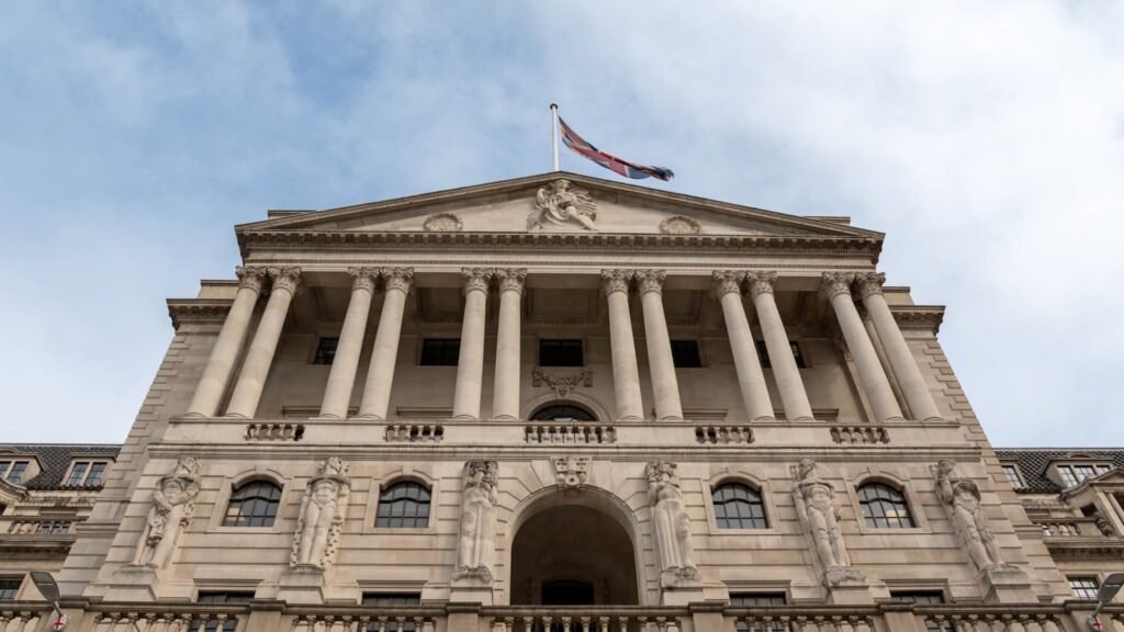 A Union flag flutters from a pole atop the Bank of England, in the City of London on August 7, 2025.