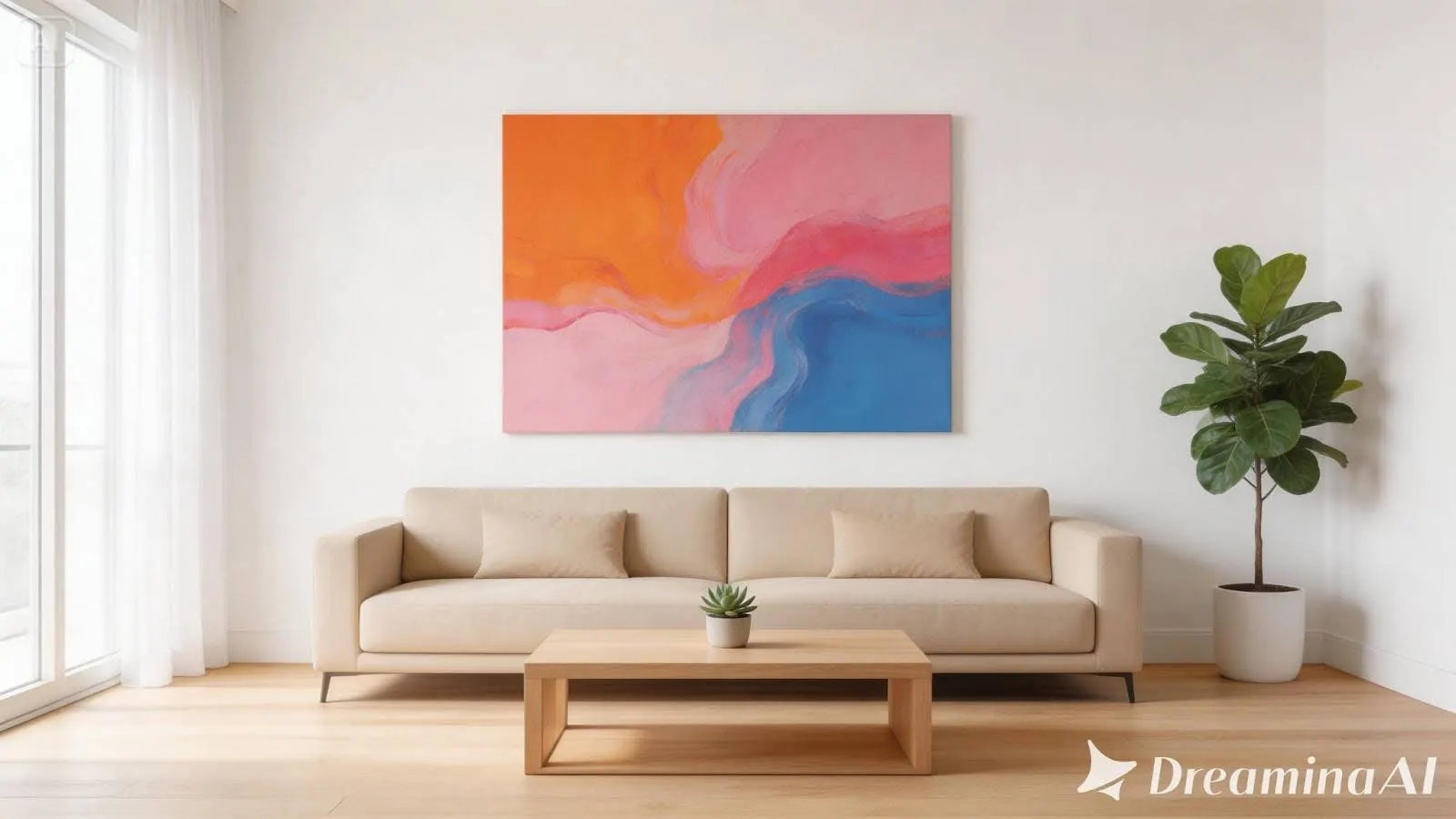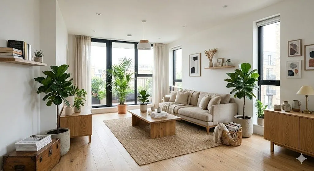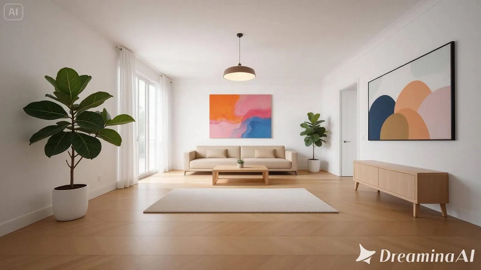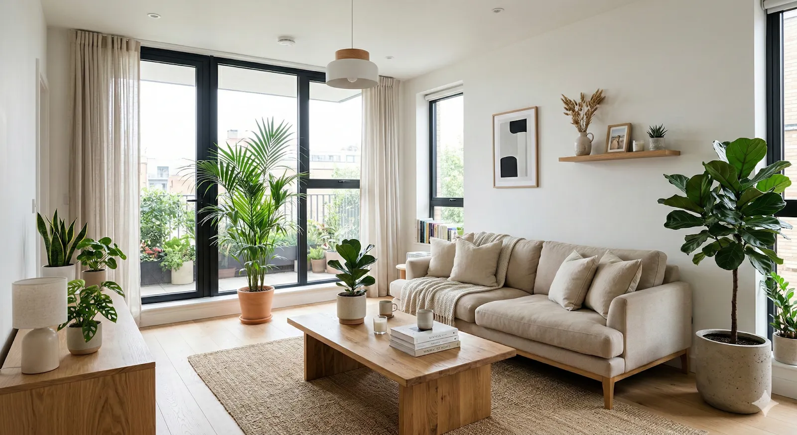 The prompt specified white walls, a beige sofa, a wooden coffee table, and indoor plants—a straightforward brief with clear architectural parameters.