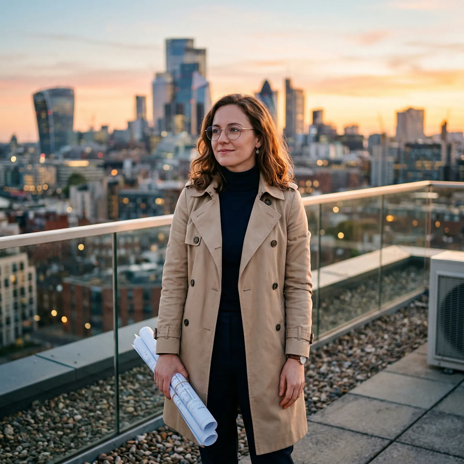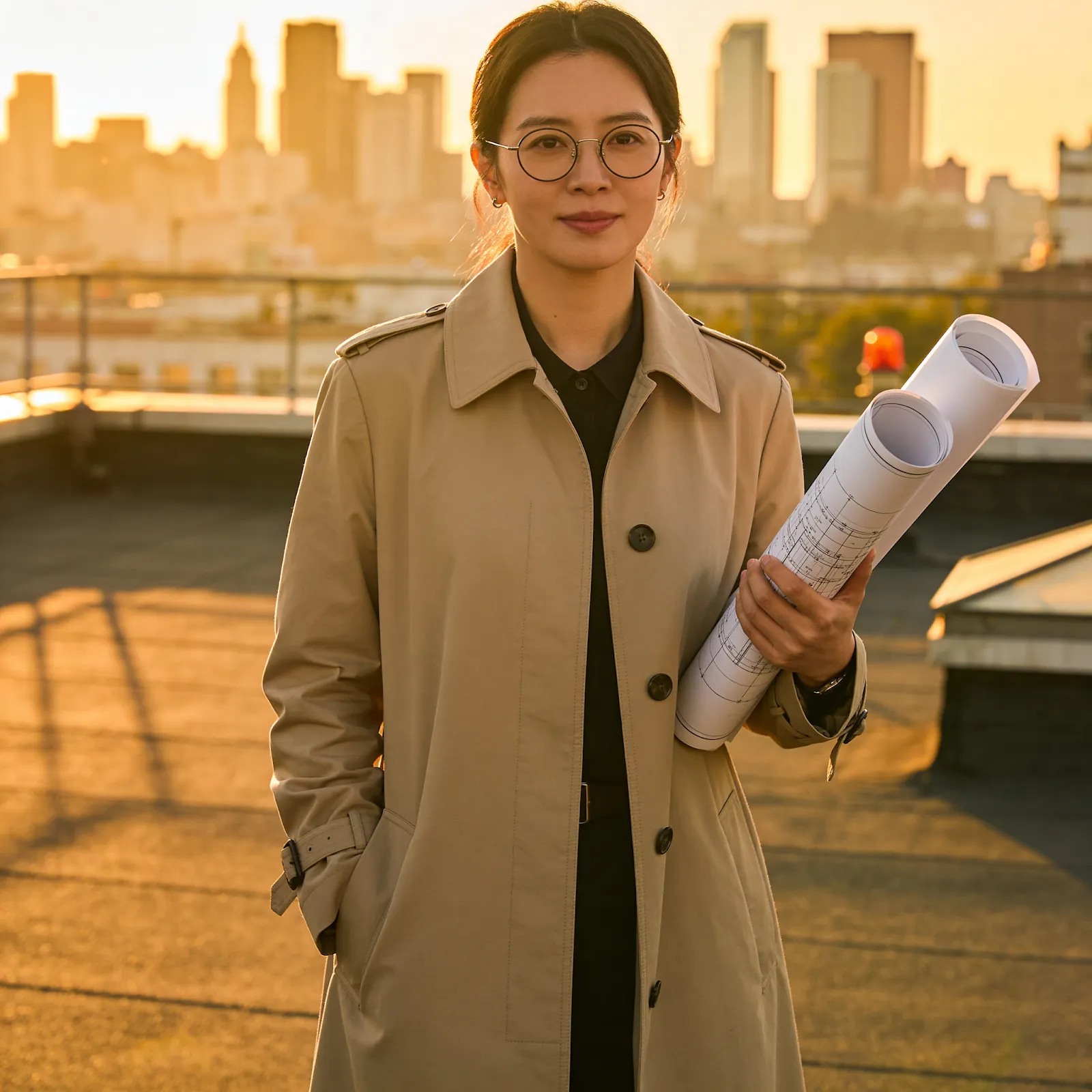The beige trench coat, round glasses, and rolled blueprints in the left hand were all correctly rendered. The rooftop and blurred skyline were present and spatially convincing.