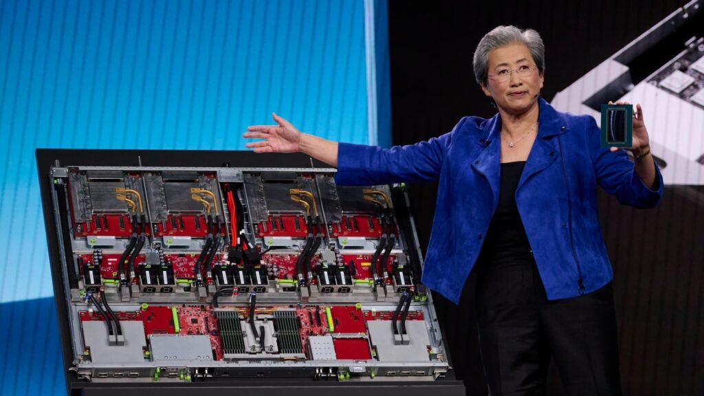 Lisa Su, chair and chief executive officer of Advanced Micro Devices Inc., displays an AMD Instinct MI455X GPU during the 2026 CES event in Las Vegas, Jan. 5, 2026.