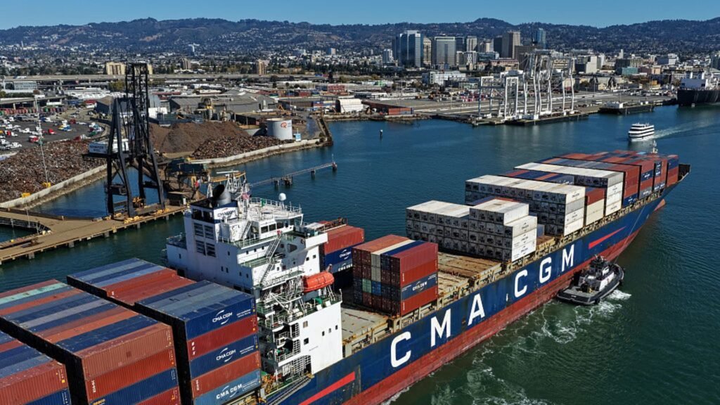 In an aerial view, a container ship arrives at the Port of Oakland on October 10, 2025 in Oakland, California. U.S. President Donald Trump is threatening to impose a massive increase of tariffs on Chinese imports in response to China’s announcement of new export controls on rare earths. China controls an estimated 70% of the global supply of rare earths minerals.