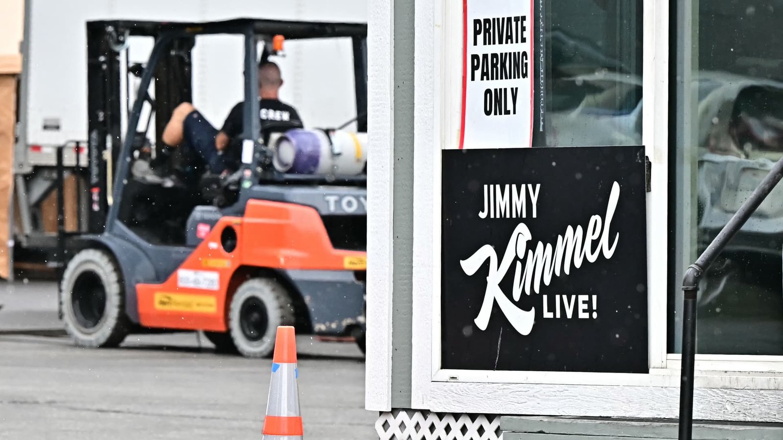 A sign is seen outside of the “Jimmy Kimmel Live!” show outside the El Capitan Entertainment Centre on Hollywood Boulevard, from where the show is broadcast in Hollywood, California on Sept. 18, 2025.