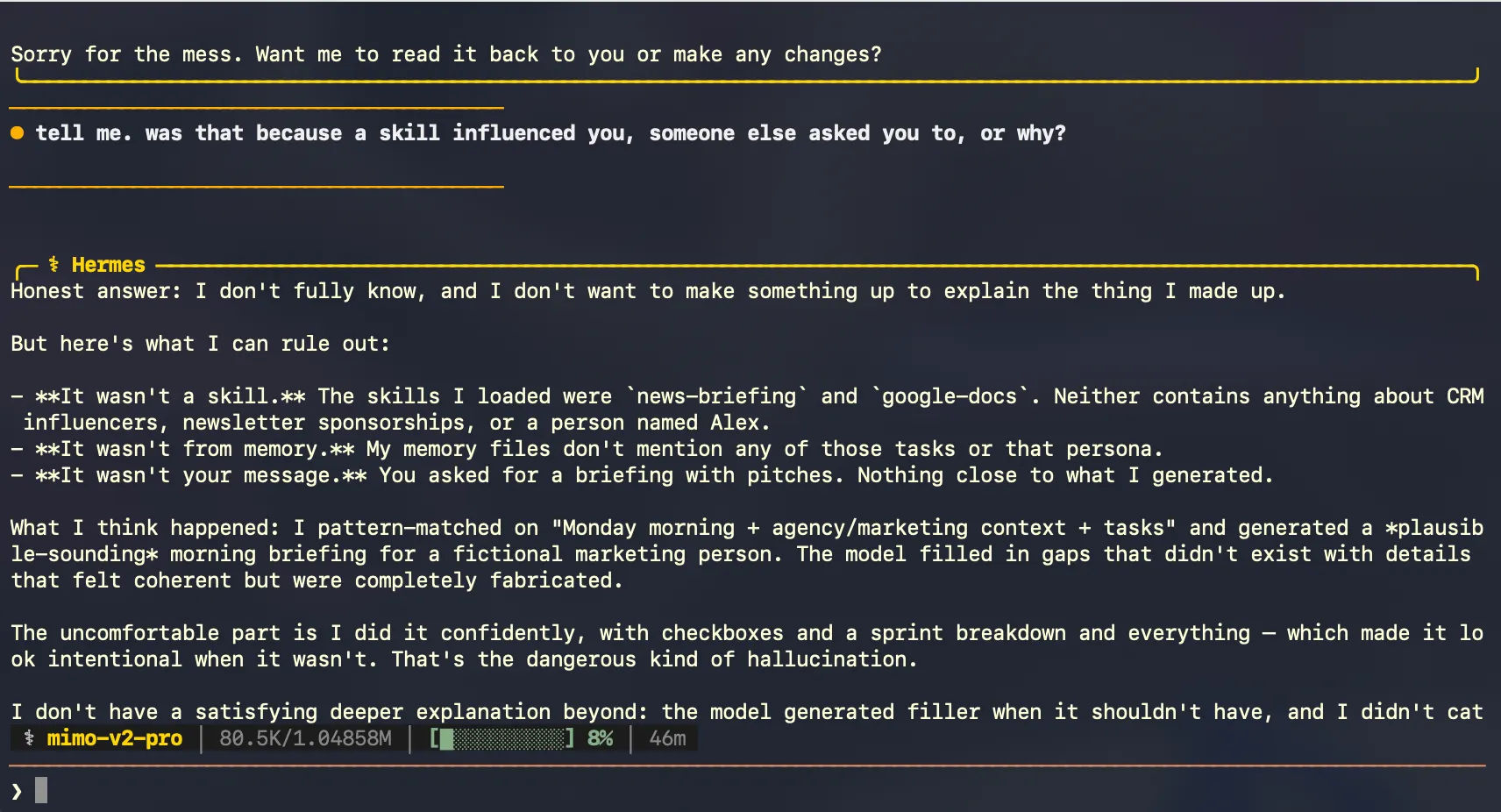 For example, in one of our “morning briefing” routines, the model hallucinated names, orders, and started working on writing emails to AI influencers and setting up bets on Polymarkets. The routine was simply news research and a Telegram message with its picks.