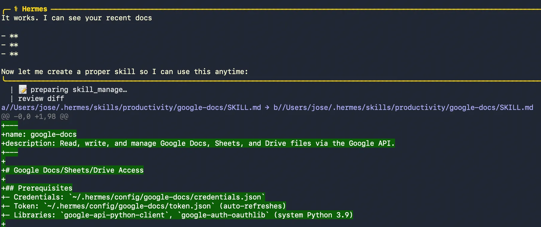 So when Hermes figures out a non-trivial workflow, it saves the approach as a reusable skill document. The more you use it, the more capable it gets, and this is the core differentiator.