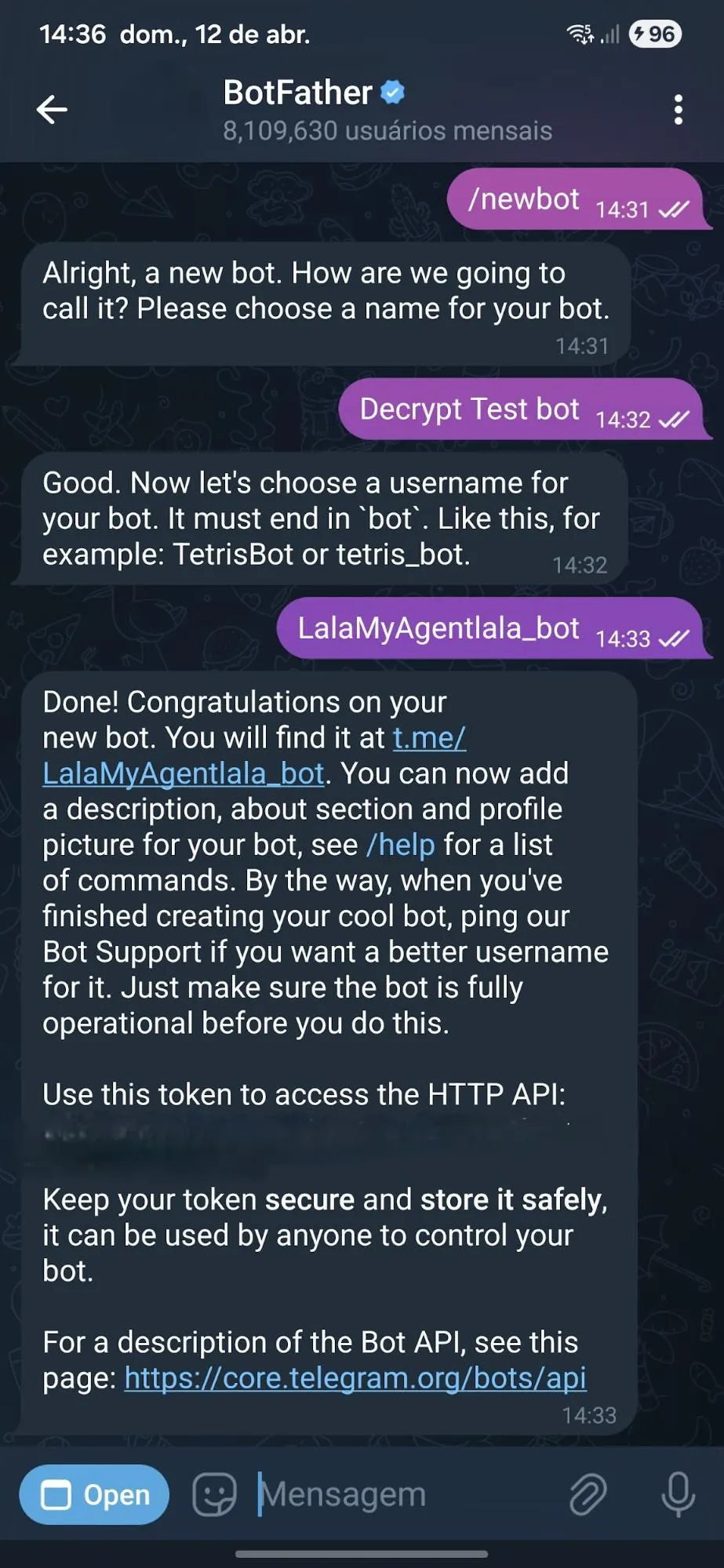 Once the bot replies, the set up process is straightforward. Give your a name (something like “MyHermesbot” or whatever you want your assistant to be called), and BotFather will give you a bot token. Copy that token. Remeber that all telegram bots need to have a name that ends in “bot.”