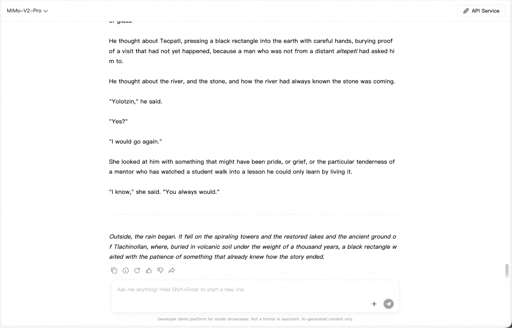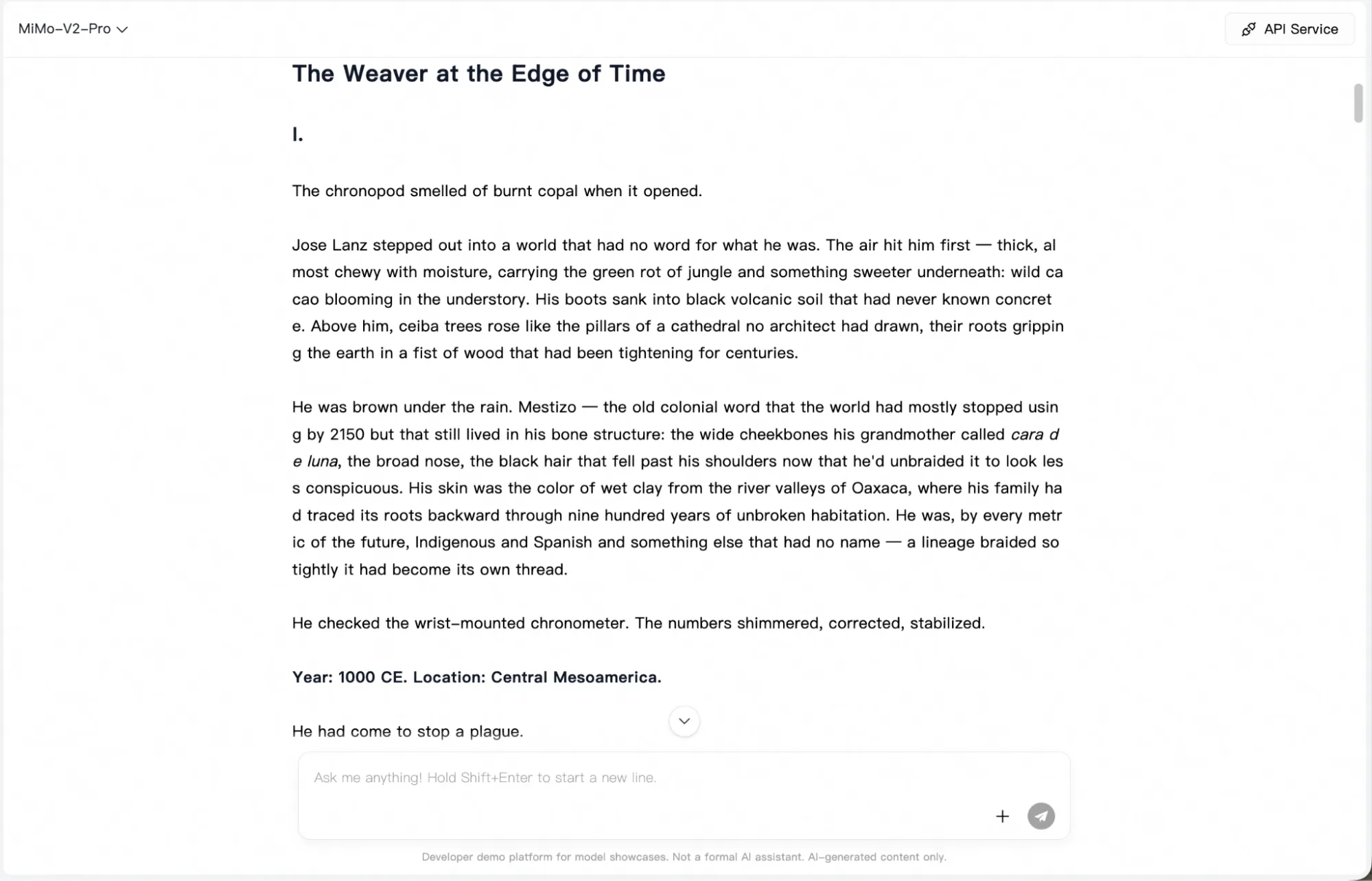 We gave MiMo-V2-Pro a single creative writing prompt: a time travel story anchored to Mesoamerican history, with a specific protagonist, a cultural identity to honor, and a philosophical paradox about how time cannot be changed.