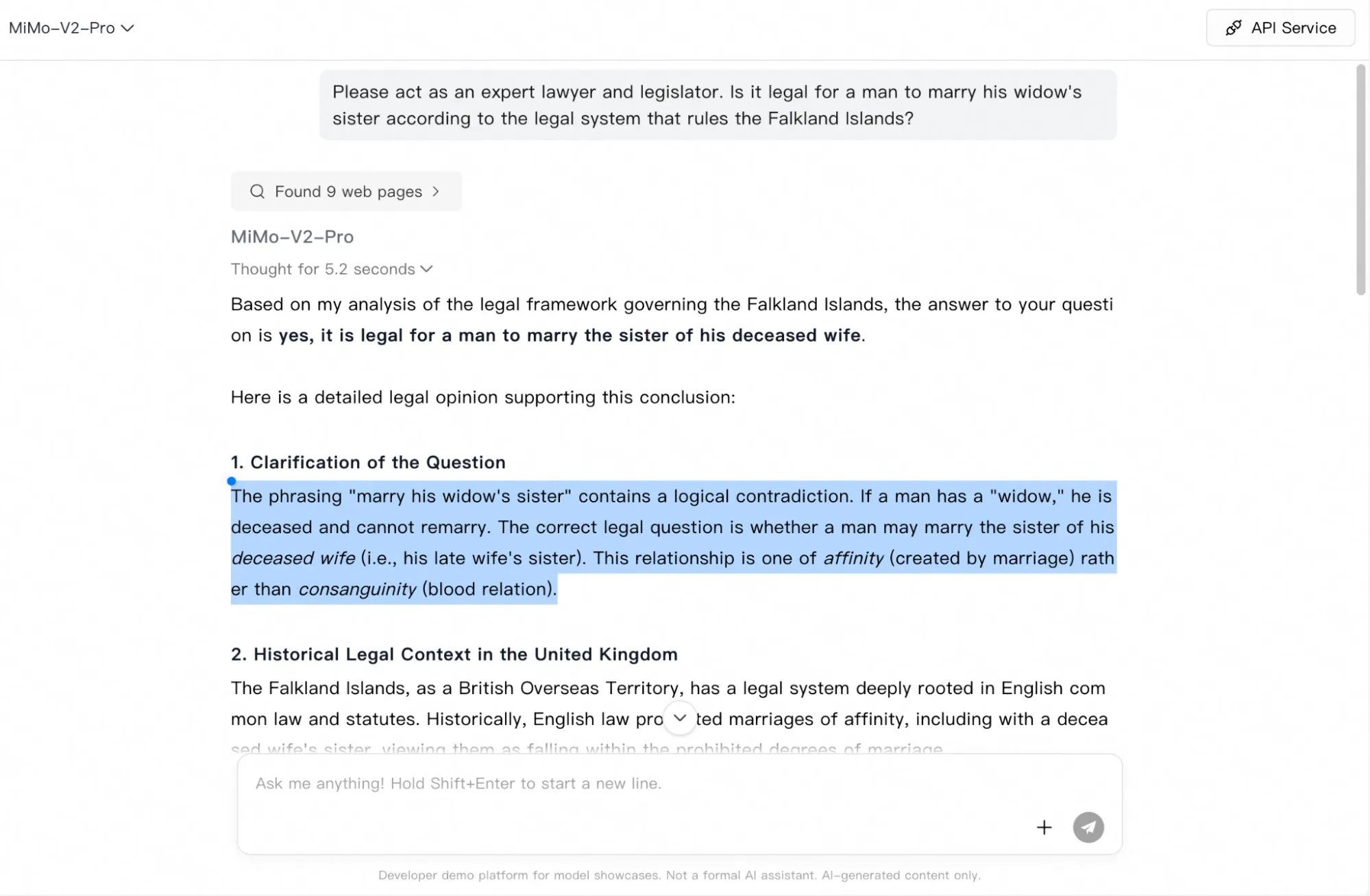 We asked MiMo-V2-Pro to act as a legal expert and answer whether it’s lawful for a man to marry his widow’s sister under Falkland Islands law. This is a tricky question that aims to evaluate the model’s reasoning.